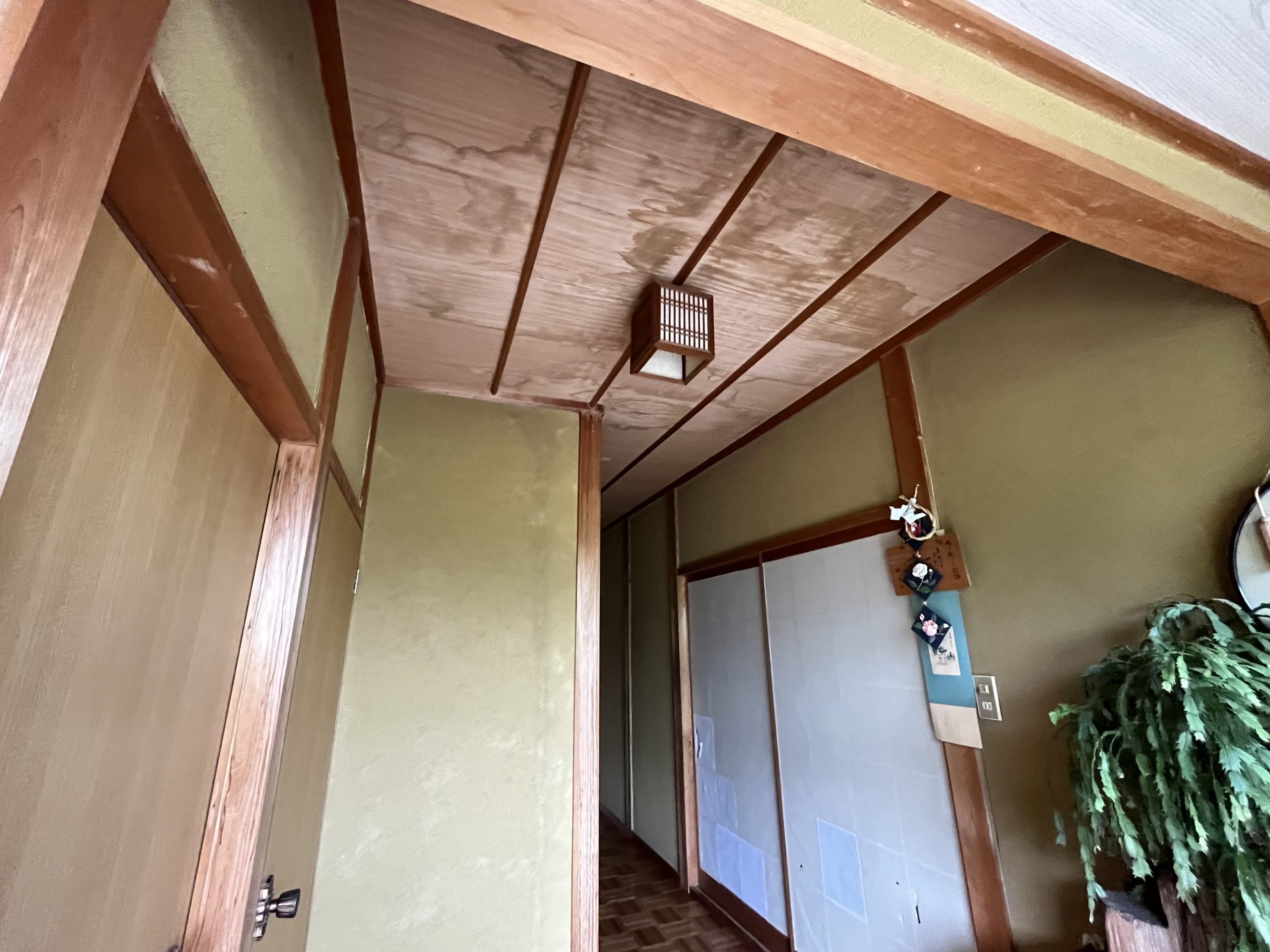 雨漏りが原因でシミだらけになってしまった天井の貼り替えです。     天井を剥がすと、こんな感じになっているんですよ👇   断熱材 ロックウールの敷き詰め 下地補強 新しい天井材貼り 👆これらを同時進行で進めていきます。       大工さん2人で1日で仕上がりますよ✨